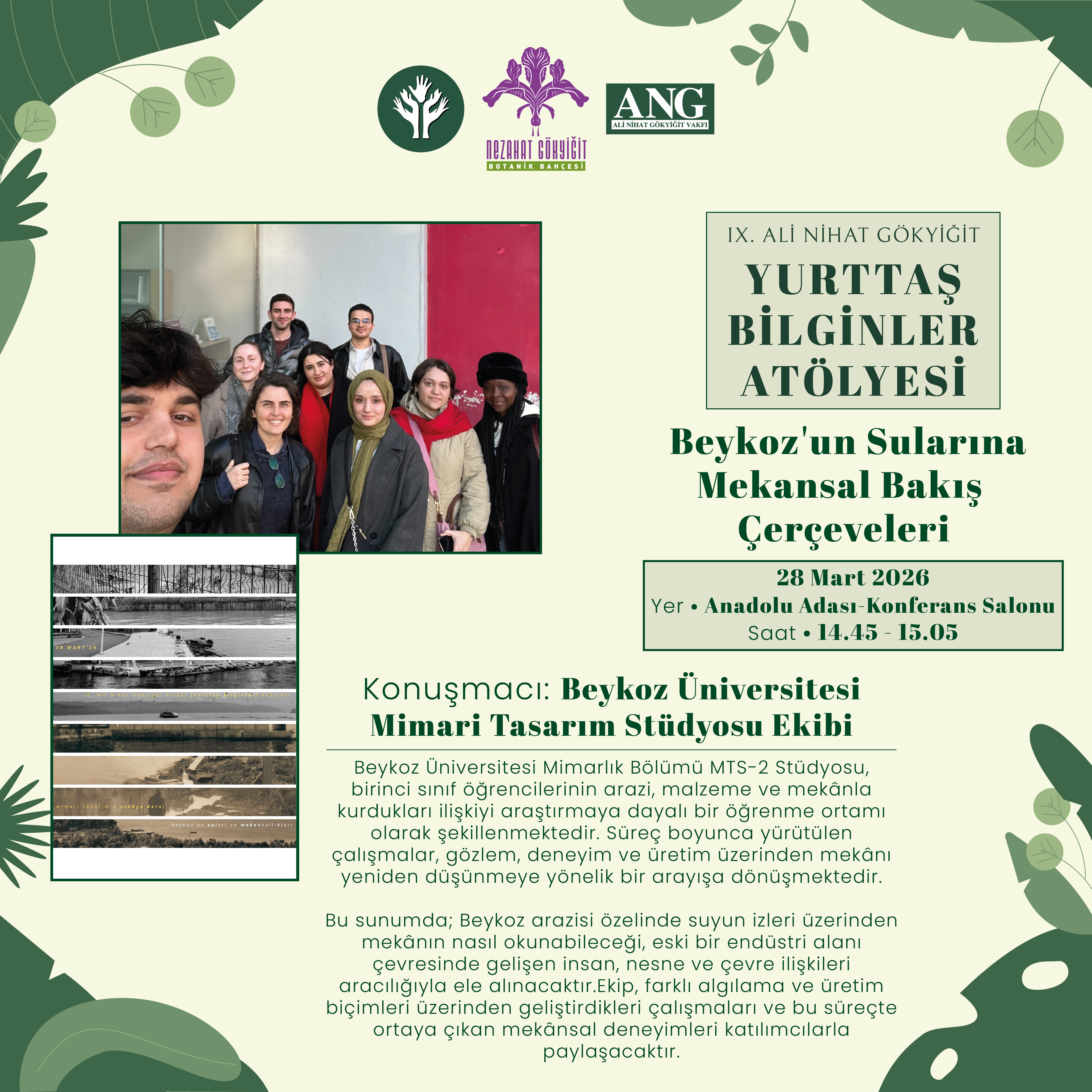 | 14.45 – 15.05 | Beykoz Üniversitesi Mimari Tasarım Stüdyo Ekibi: Beykoz'un Sularına Mekansal Bakış Çevçeveleri | Anadolu Adası – Konferans Salonu |