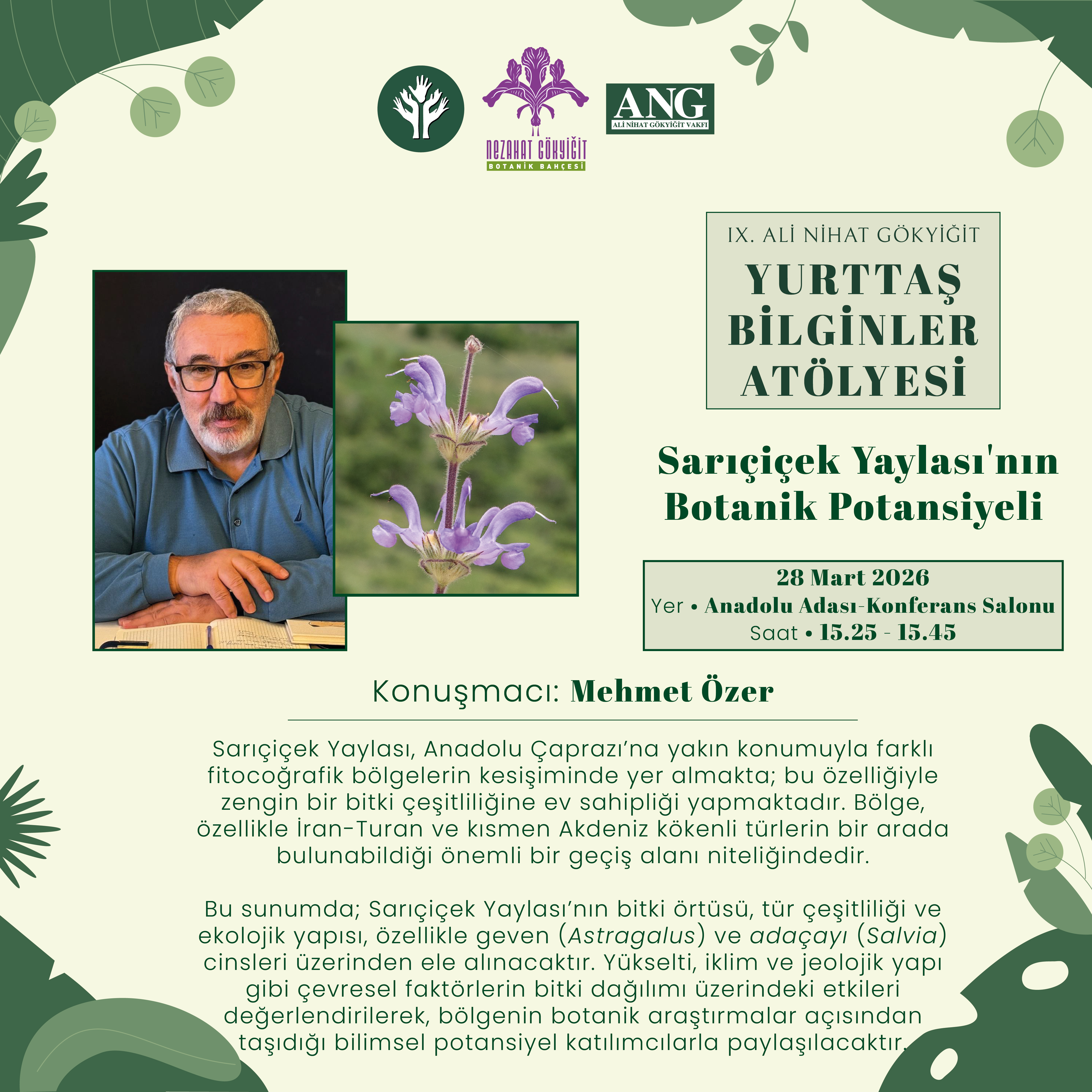 | 15.25 – 15.45 | Mehmet Özer: Sarıçiçek Yaylası’nın Botanik Potansiyeli | Anadolu Adası – Konferans Salonu |