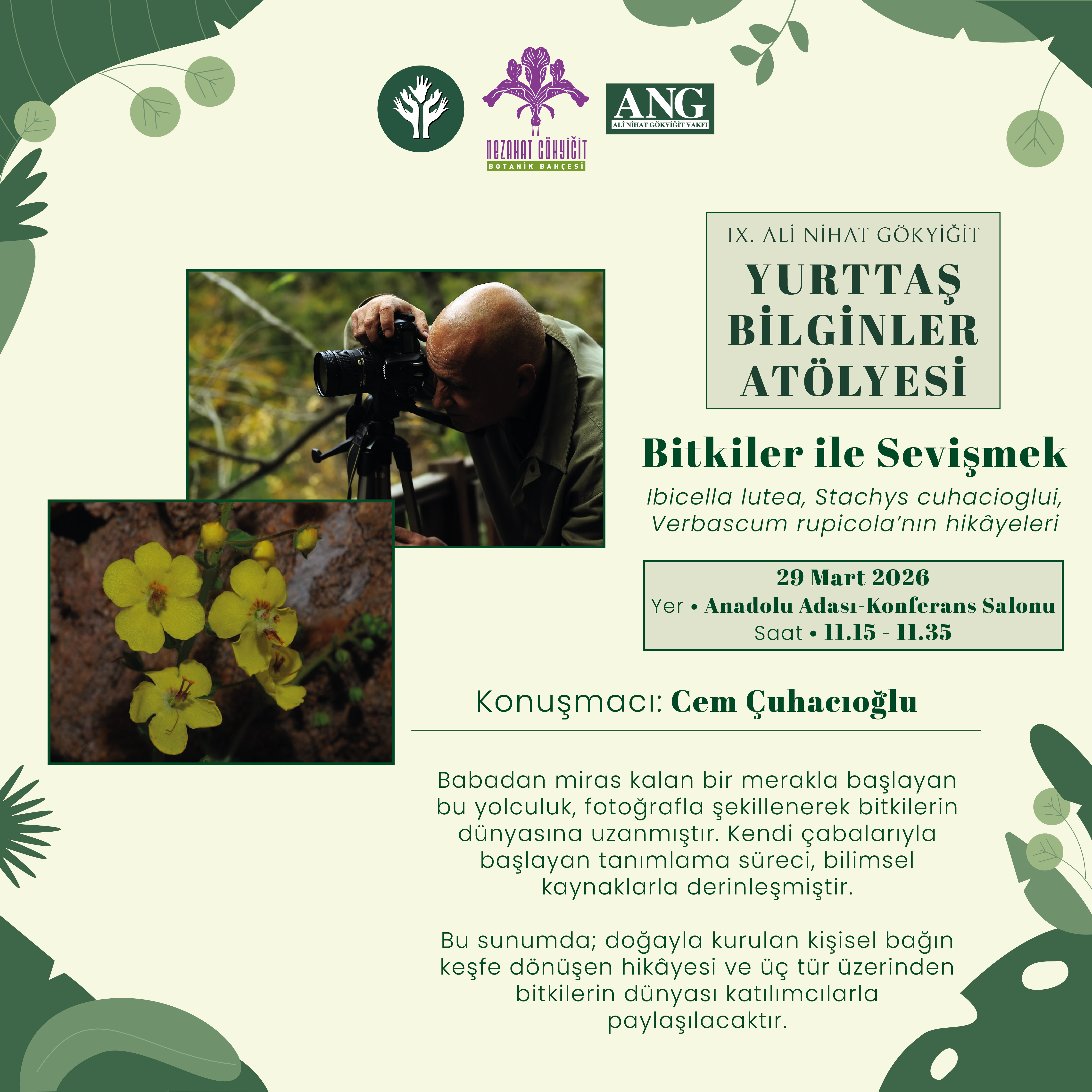 | 11.15 – 11.35 | Cem Çuhacıoğlu: Bitkilerle Sevişmek | Anadolu Adası – Konferans Salonu |