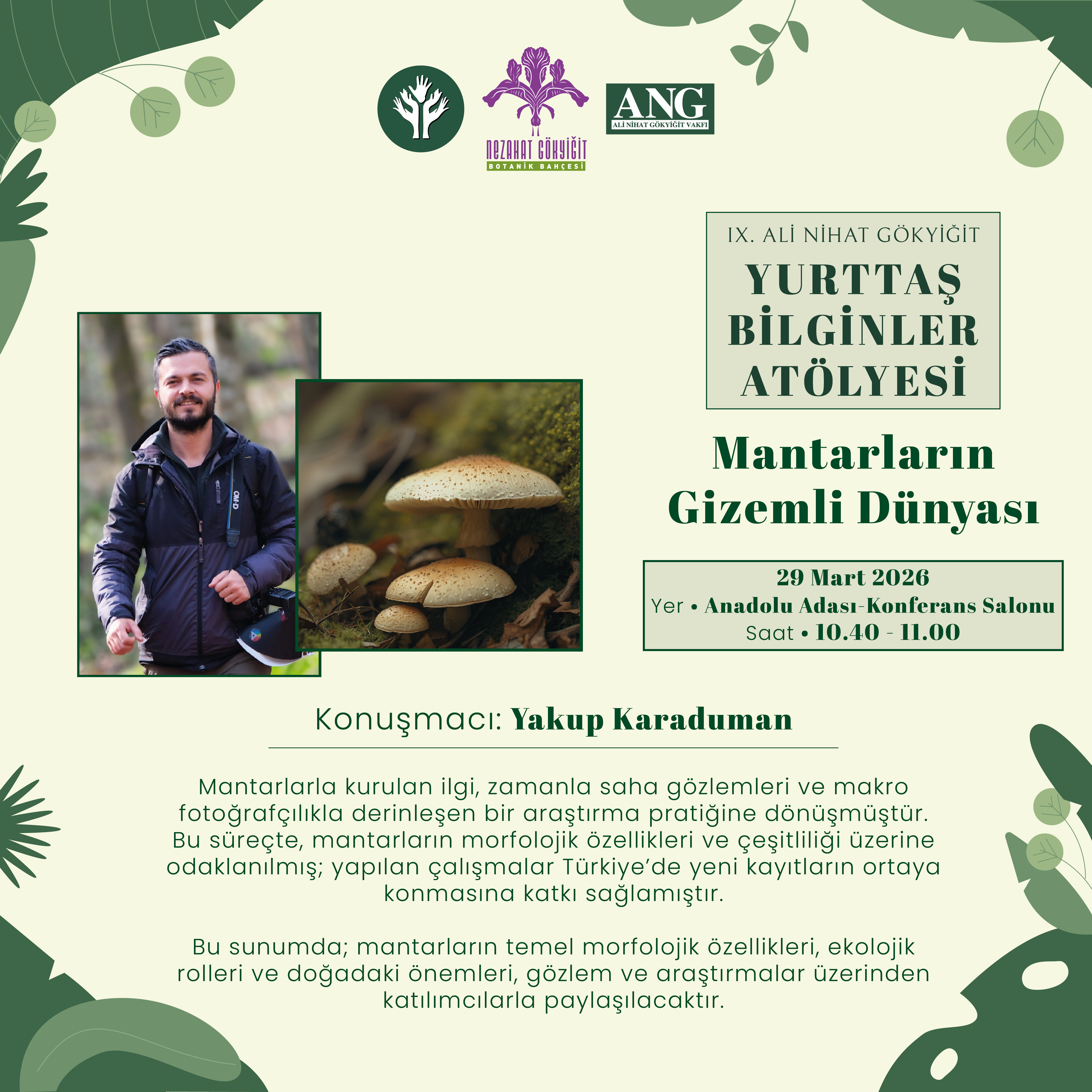 | 10.40 – 11.00 | Yakup Karaduman: Mantarların Gizemli Dünyası | Anadolu Adası – Konferans Salonu |